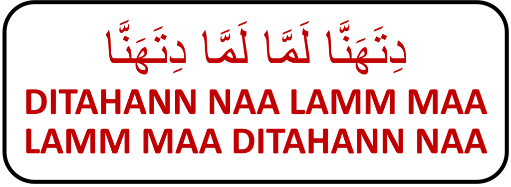 Perhatikan penulisan bacaan transliterasi Latin dengan huruf N dan M ditulis ganda. Pada titik-titik tersebut bacaan harus didengungkan. Selain ditahan lama, bacaan gunnah juga harus didengungkan dengan memasukkan getaran ke dalam rongga hidung.